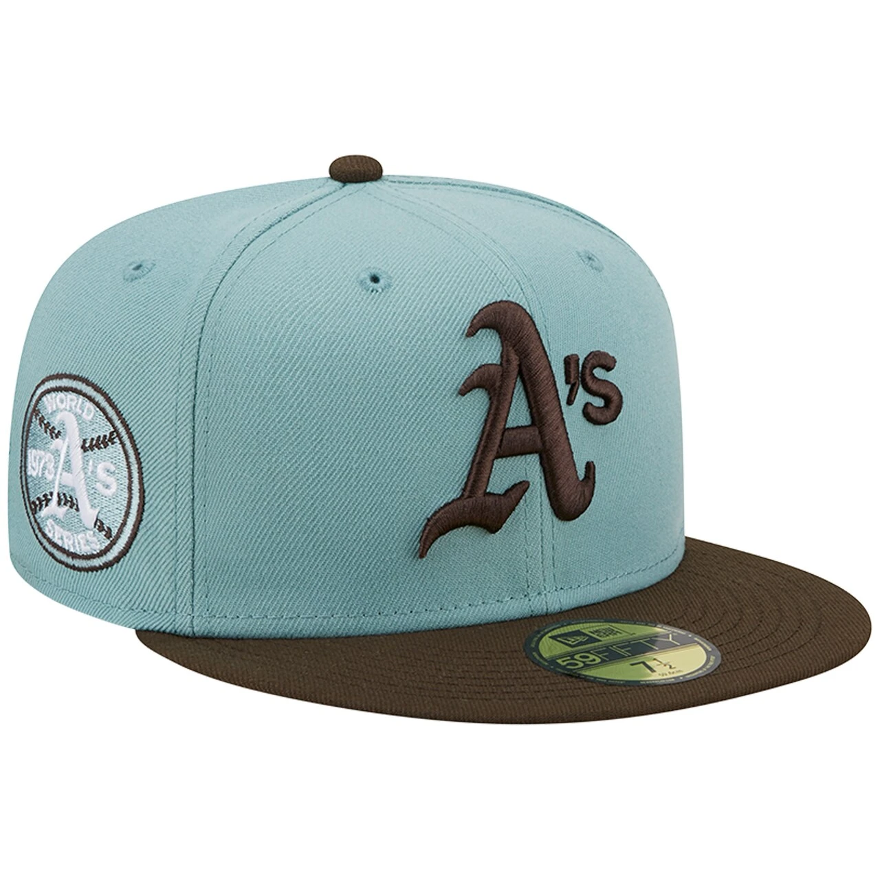Men’s Oakland Athletics New Era Light Blue/Brown 1973 World Series Beach Kiss 59FIFTY Fitted Hat